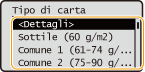 Per controllare le impostazioni dettagliate per un tipo di carta, selezionare <Dettagli> selezionare il tipo di carta da controllare.