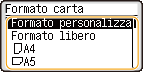 Se è necessario cambiare frequentemente la carta da caricare, impostare su <Formato libero>; ciò ridurrà il numero di passaggi necessari per modificare l’impostazione ogni volta. È inoltre possibile visualizzare un messaggio di errore quando l’impostazione nel driver della stampante è notevolmente diversa dal formato della carta caricata. <Form.crta nn corr. fonte al.crta frm.lib>