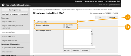 Selezionare la precondizione (criterio predefinito) per consentire o rifiutare la comunicazione di altri dispositivi con la macchina, quindi specificare gli indirizzi MAC delle eccezioni.