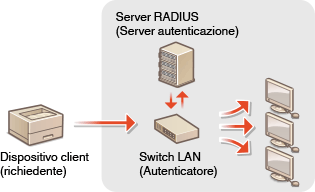 Se un dispositivo tenta di collegarsi e avviare la comunicazione su una rete 802.1X, il dispositivo deve passare attraverso l'autenticazione utente al fine di dimostrare che la connessione viene effettuata da un utente autorizzato. Le informazioni di autenticazione vengono inviate a e controllate da un server RADIUS, il quale consente o rifiuta la comunicazione alla rete in base al risultato dell'autenticazione. Se l'autenticazione fallisce, un commutatore LAN (o un punto di accesso) blocca l'accesso dall'esterno della rete. La macchina può collegarsi ad una rete 802.1X come dispositivo client.