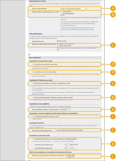 Specificare i metodi di accesso dell'utente (Metodo di accesso) e i dispositivi di autenticazione (Dispositivo di autenticazione). Non dimenticare che i dispositivi di autenticazione devono essere impostati prima di configurare le impostazioni riportate di seguito.