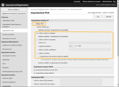 Selezionare [Utilizzo IPv6] e configurare le impostazioni necessarie.