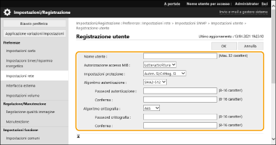 3 | Fare clic su [Impostazioni utente]  [Registrazione]. [Nome utente] Immettere caratteri alfanumerici per il nome utente. [Autorizzazione accesso MIB] Selezionare [Lettura/Scrittura] o [Solo lettura] per i privilegi di accesso agli oggetti MIB. [Lettura/Scrittura] | Consente sia di visualizzare sia di modificare i valori degli oggetti MIB. | [Solo lettura] | Permette solo di visualizzare i valori degli oggetti MIB. |