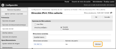 Haga clic en [Eliminar] para la dirección cuya excepción desee eliminar.