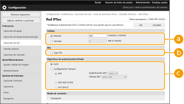 Se lleva a cabo la autenticación y el cifrado. Seleccione el algoritmo para [Autenticación ESP] y [Cifrado ESP]. Seleccione [NULO] si no desea configurar el algoritmo de autenticación y cifrado.