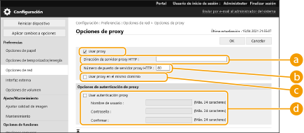 Seleccione la casilla de verificación [Usar proxy] y especifique las opciones necesarias.