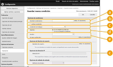 [Destino]Puede establecer un valor especificado por la operación objetivo, o uno no especificado. [Acción]Seleccione cómo manejar los documentos que cumplan las condiciones. Si selecciona [Retener como trabajo compartido], puede establecer [ID para sustitución] para especificar la salida de nombre de usuario en el registro durante la impresión. Seleccione [Cancelar] para descartar el documento. | ||||||