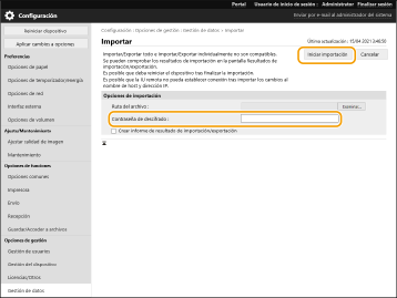 Puede importar todos los datos de configuración que se han exportado a un ordenador. Al importar, los valores de configuración establecidos previamente se sobrescriben. Tenga en cuenta, no obstante, que es posible que algunos modelos de equipo no puedan importar todos los elementos de configuración.