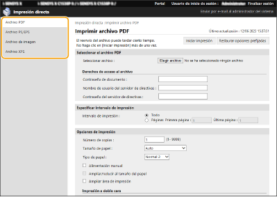 ![]() | Utilizando la IU remota, se pueden imprimir archivos guardados en un ordenador o red directamente desde el equipo sin utilizar el controlador de impresora. No tiene que abrir los archivos en el ordenador para imprimir. |