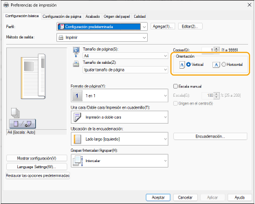 En la pantalla del controlador [Opciones básicas], establezca [Orientación] con la misma orientación que utilizó en el paso 1.