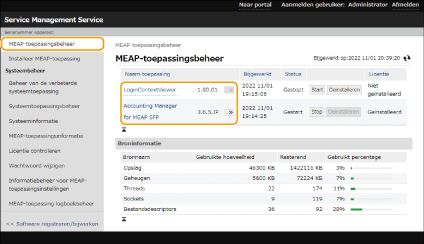 Klik op [MEAP Application Management] en klik op de toepassing om de licentie te beheren.