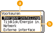 Selecteer <Instellen> om het <Menu>-scherm weer te geven. Veel van de instellingen van het apparaat, zoals de beheerinstellingen, weergave-instellingen en netwerkinstellingen, worden geconfigureerd door eerst <Instellen> te selecteren.