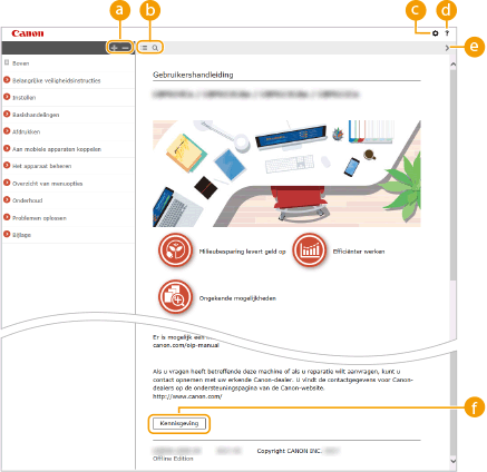 Klik hierop om informatie weer te geven over hoe u de Gebruikershandleiding kunt bekijken, hoe u een zoekopdracht uitvoert en andere informatie.