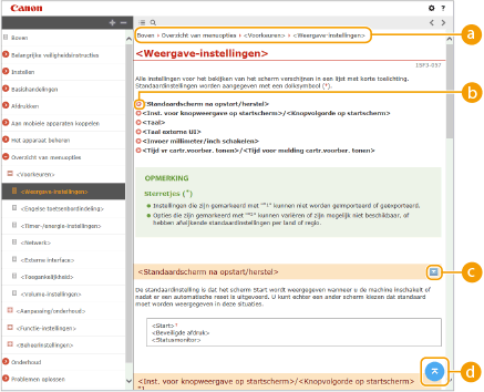 Klik hier om instellingen op te geven zoals tekstgrootte, lay-out en weergavemethode voor de Gebruikershandleiding.