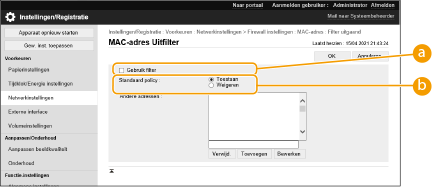Als het MAC-adres onjuist is ingevoerd, is het mogelijk dat u geen toegang meer hebt tot de machine vanaf de UI op afstand. Stel in dit geval <Gebruik filter> in op <Uit> voor <Filter uitgaand>/<Filter inkomend> in <MAC-adresfilter> in het bedieningspaneel.