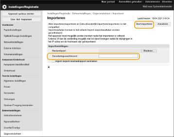 Voer bij [Decoderingswachtwoord] hetzelfde wachtwoord in dat is ingevoerd toen de instellingengegevens werden geëxporteerd.