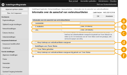 U kunt een link instellen naar de website voor het aanschaffen van verbruiksmaterialen, die wordt weergegeven wanneer u informatie over verbruiksmaterialen controleert vanuit de UI op afstand. Het instellen van een link naar de website maakt het gemakkelijker voor gebruikers om verbruiksmaterialen te kopen.