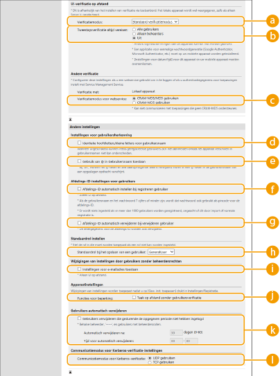 Geef de aanmeldingsmethodes van gebruikers (Aanmeldingsmethode) en verificatieapparaten (Verificatieapparaat) op. Merk op dat de verificatieapparaten eerst moeten worden ingesteld voordat u onderstaande instellingen configureert.