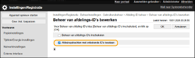 U kunt afdelings-ID-beheer gebruiken voor het beheer van afdrukbewerkingen die via een computer worden uitgevoerd. Gebruik deze functie wanneer u de beveiliging wilt verbeteren of het aantal pagina's dat wordt afgedrukt, wilt controleren.