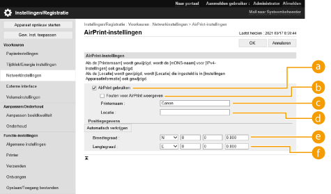 Als u zich aanmeldt met beheerdersbevoegdheden, kunt u de AirPrint-instellingen ook wijzigen vanuit de pagina voor AirPrint.