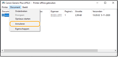 Als u het document dat u wilt annuleren, niet kunt vinden, is het al naar de machine verzonden. In dat geval kunt u het afdrukken niet op de computer annuleren.