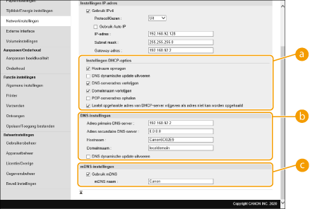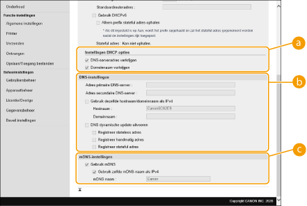 2 | Configureer IPv4 DNS-instellingen. ![]() [Instellingen DHCP-opties][Hostnaam opvragen] Selecteer het selectievakje om Optie 12 in te schakelen om de hostnaam van de DHCP-server te verkrijgen. [DNS dynamische update uitvoeren] Selecteer het selectievakje om Optie 81 in te schakelen om de DNS-records dynamisch bij te werken via de DHCP-server. [DNS-serveradres verkrijgen] Selecteer het selectievakje om Optie 6 in te schakelen om een DNS-serveradres te verkrijgen van de DHCP-server. [Domeinnaam verkrijgen] Selecteer het selectievakje om Optie 15 in te schakelen om een domeinnaam van de DHCP-server te verkrijgen. [POP-serveradres ophalen] Selecteer het selectievakje om Optie 70 in te schakelen om een POP-serveradres te verkrijgen van de DHCP-server. [Laatst opgehaalde adres van DHCP-server vrijgeven als adres niet kan worden opgehaald] Deselecteer het selectievakje om het handmatig ingevoerde IP-adres te gebruiken wanneer het automatisch ophalen van het IP-adres mislukt. [DNS-instellingen][Adres primaire DNS-server] Voer het IP-adres van een DNS-server in. Adres secundaire DNS-server[] Voer het IP-adres van een secundaire DNS-server in, indien van toepassing. [Hostnaam] Voer alfanumerieke tekens in voor de hostnaam van de machine die moet worden geregistreerd op de DNS-server. [Domeinnaam] Voer alfanumerieke tekens in voor de naam van het domein waartoe de machine behoort, zoals „voorbeeld.com.” [DNS dynamische update uitvoeren] Selecteer het selectievakje om de DNS-gegevens dynamisch bij te werken wanneer het IP-adres van de machine wordt gewijzigd. [mDNS-instellingen][Gebruik mDNS] MDNS (multicast DNS), overgenomen door Bonjour, is een protocol voor het koppelen van een hostnaam aan een IP-adres zonder gebruik te maken van DNS. Schakel het selectievakje in om mDNS in te schakelen en voer de mDNS-naam in het tekstvak [mDNS naam] in. |