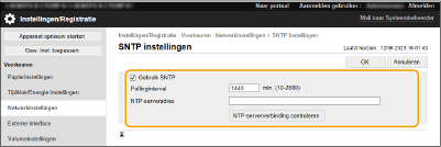 Simple Network Time Protocol (SNTP) maakt het mogelijk de systeemklok aan te passen door gebruik te maken van de tijdserver in het netwerk. Als SNTP wordt gebruikt, wordt de tijdserver op de opgegeven intervallen gecontroleerd; daarom kan altijd de juiste tijd worden aangehouden. SNTP-instellingen kunnen worden opgegeven via de UI op afstand.