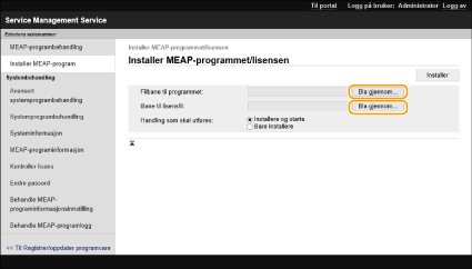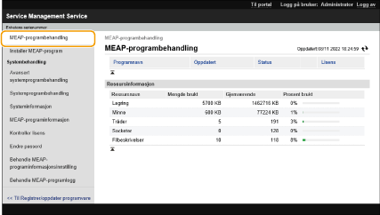 Du kan kontrollere antallet apper installert og lagringsplassen som brukes på enheten. Administrere MEAP-apper Hvis MEAP-appen din ikke kommer med et lisenstilgangsnummer (License Access Number), leveres lisensfilen av MEAP-appleverandøren. Lisensnøkkelen og lisensfilen som beskrives i denne delen, kreves ikke. Hvis du vil ha mer informasjon, kan du se i bruksanvisningen som følger med hver MEAP-app. Avhengig av MEAP-appen, kan den kreve bestemte betingelser for installasjon. Hvis du vil ha mer informasjon, kan du se i bruksanvisningen for MEAP-appen som skal brukes. Maksimum antall MEAP-apper som kan installeres på denne maskinen er 20. |