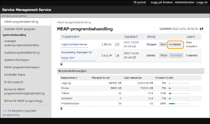 1 | Klikk på [MEAP Application Management] [Uninstall] for appen som skal avinstalleres.![]() |