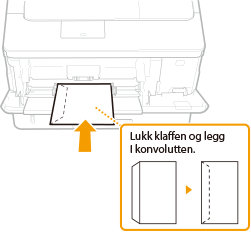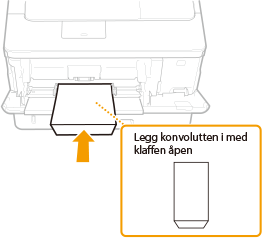 Legg konvolutter i papirskuffen eller i multibrettet. Når du skriver ut på konvolutter, må du sørge for å flate ut eventuelle ujevnheter på konvoluttene før du legger dem i, for å unngå papirstopp og bretter. Pass også på at konvoluttene legges inn i riktig retning og med riktig side opp. Vær oppmerksom på at konvolutter ikke legges i papirskuffen.