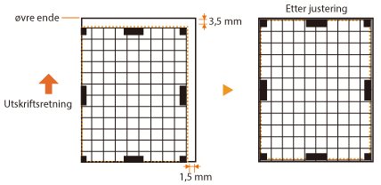 I det følgende eksempelet, fordi det er nødvendig å flytte utskriftsposisjonen 3,5 mm opp og 1,5 mm til høyre, angir du -3,5 mm i vertikal retning og +1,5 mm i horisontal retning.