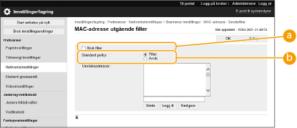 Velg forutsetningen (standard policy) for å tillate eller avvise kommunikasjon av andre enheter med maskinen, og angi MAC-adresser for unntak.