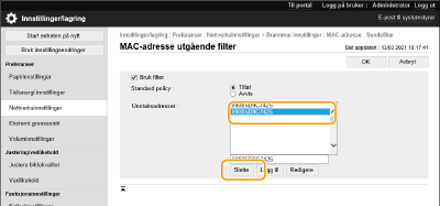 Hvis MAC-adressen er feil angitt, kan det være at du ikke får tilgang til maskinen fra det eksterne brukergrensesnittet. I dette tilfellet, sett <Bruk filter> til <Av> for <Sendefilter>/<Mottaksfilter> i <MAC-adressefilter> fra kontrollpanelet.