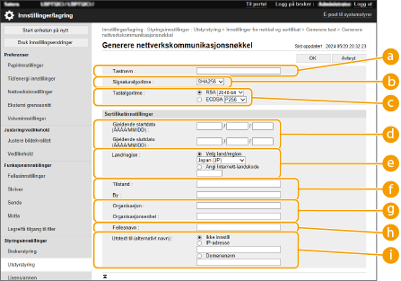 | | Maskinen kan generere nøkkel og sertifikat (serversertifikat) som brukes for TLS-kryptert kommunikasjon. Hvis du vil begynne å bruke TLS-kryptert kommunikasjon umiddelbart, er det praktisk å bruke nøkkelen og sertifikatet som er forhåndsinstallert på maskinen. Spør, om nødvendig, en administrator om å generere en nøkkel og et sertifikat. Vær imidlertid oppmerksom på at TLS-kryptert kommunikasjon ikke aktiveres bare ved å generere en nøkkel og et sertifikat. Konfigurere nøkkel og sertifikat for TLS |