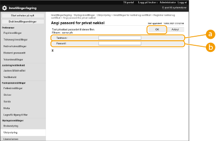 2 | Skriv inn nøkkelens navn og passord, og klikk på [OK]. [Tastnavn]Bruk alfanumeriske tegn til å skrive inn navnet på nøkkelen som ble registrert til maskinen. [Passord]Bruk alfanumeriske tegn til å skrive inn passordet for den private nøkkelen som er angitt for filen som skal registreres. |
