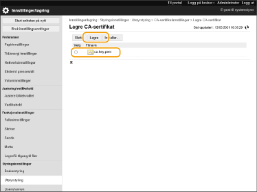 Du kan bruke Fjernkontroll til å lagre nøkler/sertifikater, CA-sertifikater til maskinen fra datamaskinen. Tilordne en administratorer til å lagre disse elementene.