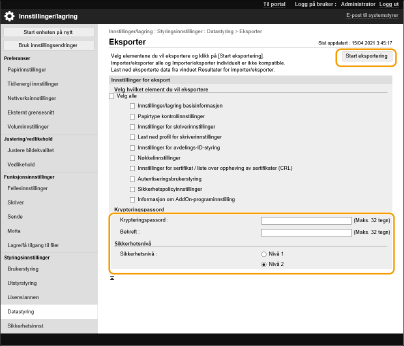 For å kryptere alle innstillingsdataene, velger du [Nivå 2] i [Sikkerhetsnivå].