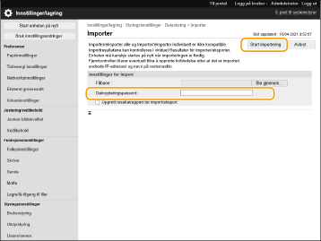 Du kan importere alle innstillingsdataene som ble eksportert, til en datamaskin. Når du importerer, overskrives de tidligere konfigurerte innstillingsverdiene. Merk at noen maskinmodeller kanskje ikke kan importere ikke kan importere alle innstillingselementene.