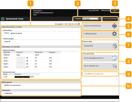 Noen skjermelementer og funksjoner er kun tilgjengelige hvis du logger inn med administratorrettigheter. Hvis flere brukere betjener Fjernkontroll samtidig eller kontrollpanelet til maskinen blir betjent samtidig som Fjernkontroll, er den siste handlingen som utføres, effektiv. |