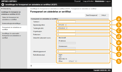 En forespørsel om å utstede sertifikatet som kreves for nøkler generert med maskinen, kan sendes til en SCEP-server (Simple Certificate Enrollment Protocol) som behandler sertifikater. Sertifikater utstedt fra SCEP-serveren registreres automatisk til maskinen. Administrator-rettigheter kreves for å sende en forespørsel om å utstede et sertifikat.