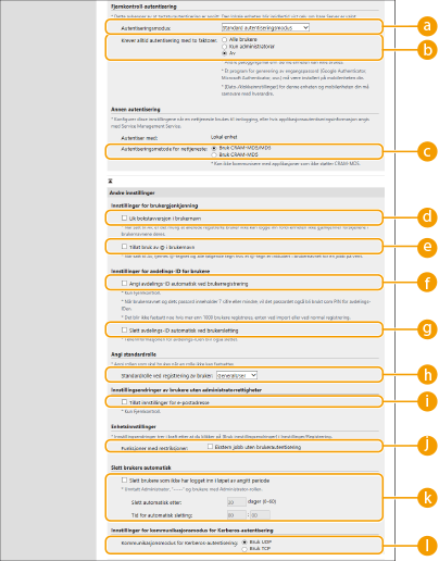 Velg godkjenningsmodus som skal brukes for pålogging på fjernkontroll. Når [Gjesteautentiseringsmodus] velges, kan brukere som ikke er registrerte, også logge seg på ved å klikke på [Innloggingssted:]. Velg [Administratorautentiseringsmodus] for å kun tillate at brukere med administratorprivilegier logger inn.