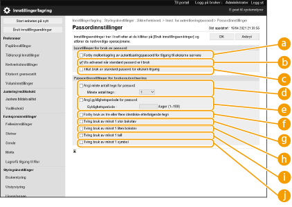 Du kan angi en policy for sperring (tilstanden hvor brukerne midlertidig ikke kan logge inn på maskinen) og passordoperasjon/innføring.