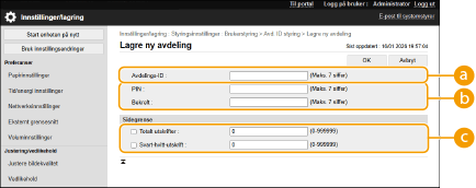 Du kan begrense antall sider som en lagret avdeling kan skrive ut. Velg måltypen og skriv inn antall sider.