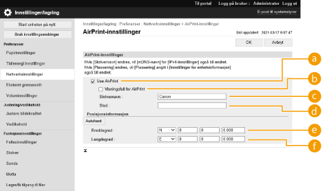 Hvis du logger på med administratorrettigheter, kan du også endre AirPrint-innstillingene fra siden for AirPrint.