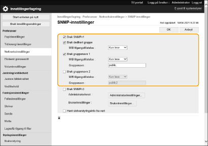 Simple Nettverk Management Protocol (SNMP) er en protokoll for overvåking og kontroll av kommunikasjonsenheter i et nettverk ved hjelp av Management Information Base (MIB). Maskinen støtter SNMPv1 og sikkerhetsutvidet SNMPv3. Du kan kontrollere maskinens status fra en datamaskin når du skriver ut dokumenter eller bruker fjernkontrollen. Du kan aktivere enten SNMPv1 eller SNMPv3 eller begge samtidig. Angi innstillingene for hver versjon som passer ditt nettverksmiljø og formålet med bruken.