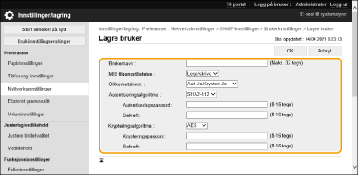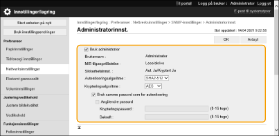 1 | Klikk på [Administratorinnst.]. [Bruk administrator] Merk av i boksen for å bruke administratorbrukeren. [Autentiseringsalgoritme] og [Krypteringsalgoritme] kan ikke endres. [Bruk samme passord som for autentisering] Velg avmerkingsboksen for å bruke samme passord som passordet som brukes i brukerautentiseringen. |