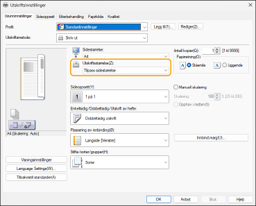 3 | Sjekk utskriftsforhåndsvisningen og still inn [Sideoppsett] [Siderekkefølge] [1-sidig/2-sidig/Utskrift av hefte] [Plassering av innbinding]. |