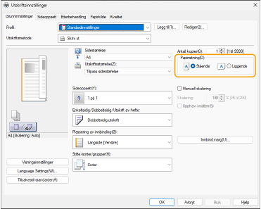2 | På [Basisinnstillinger]-skjermen til driveren stiller du inn [Papirretning] til samme orientering som du stilte inn i trinn 1. |