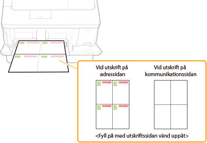 I det här avsnittet beskrivs hur du fyller på brevkort i önskad riktning och vad du måste göra innan du fyller på brevkort. Se Grunder för papperspåfyllning om du vill få en beskrivning av hur du fyller på brevkort i universalfacket. |