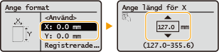 Ange längden på <X>-sidan och <Y>-sidan. Välj <X> eller <Y> för att ange längden på varje sida med sifferknapparna eller